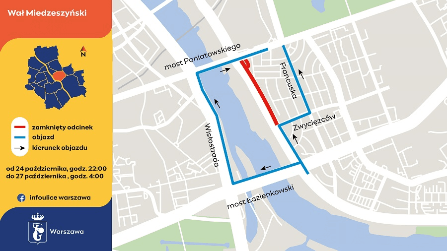 W ten sam weekend prace prowadzone będą także na Wale Miedzeszyńskim. Od piątku, 24 października, godz. 22:00, do poniedziałku, godz. 4:00 rano, nieprzejezdny będzie odcinek w kierunku Pragi-Północ, od ulicy Zwycięzców do mostu Poniatowskiego.