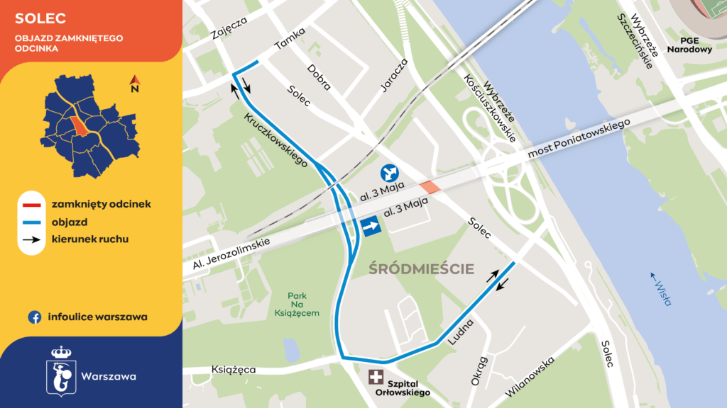 W poniedziałek o godzinie 12:00 drogowcy przywrócą po dwa pasy na ulicy Kruczkowskiego, a z robotami przeniosą się na ulicę Solec. Kierowcy nie przejadą pod wiaduktem. Objazd będzie prowadził ulicami Ludną i Kruczkowskiego do Tamki. W tym etapie robót autobusy linii 118 i 127 będą kursowały objazdem Tamką i Kruczkowskiego.