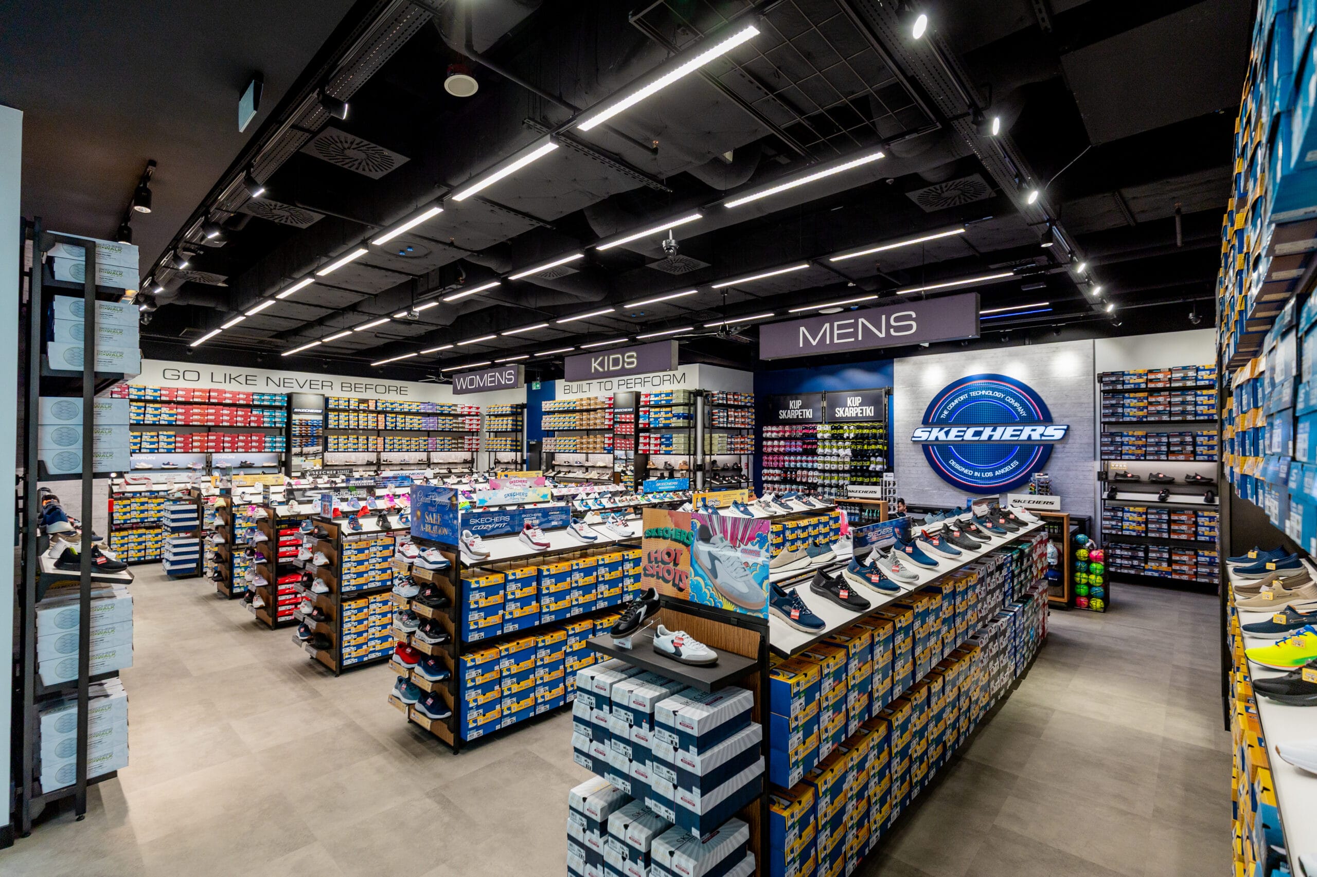 Wnętrza sklepów outletowych Skechers w FACTORY charakteryzują się otwartą przestrzenią z jasnym oświetleniem i regałami sięgającymi od ściany do ściany, eksponującymi szeroki wybór butów. Wnętrze podzielone jest na sekcje, z rzędami gondol, które tworzą samoobsługową ścieżkę klienta.