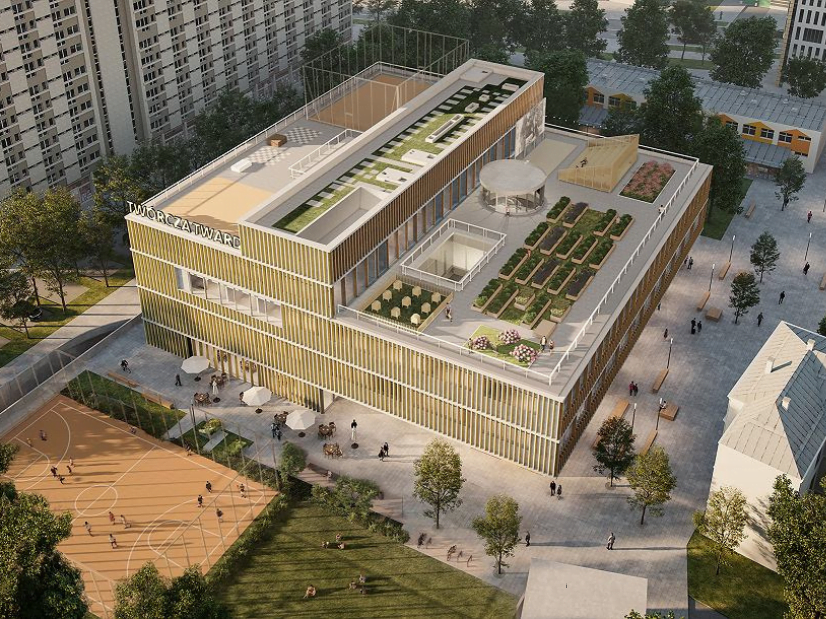 Unikatowym elementem projektu będzie amfiteatr zlokalizowany na kaskadowym dachu budynku, który stopniowo będzie się wznosił w kierunku bloku osiedla Za Żelazną Bramą. Na dachu, oprócz przestrzeni zielonej, planuje się również widownię i niewielką scenę, co otwiera możliwości organizacji koncertów i wydarzeń pod gołym niebem.