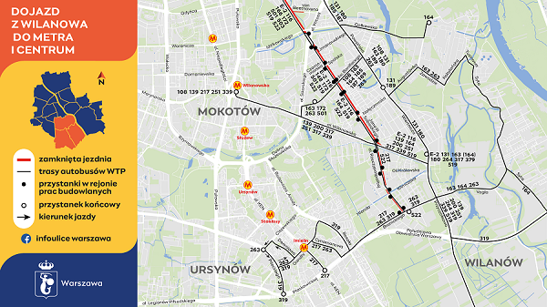 Z powodu prac zmieniony zostanie końcowy odcinek trasy autobusów linii 172. Ponieważ niemożliwy będzie skręt z ul. Jana III Sobieskiego w lewo – w św. Bonifacego, autobusy skręcą w prawo i dojadą do pętli Stegny zamiast do pętli Sadyba. Natomiast 163 i 263 pojadą prosto ulicą Powsińską do św. Bonifacego i w prawo do pętli Stegny. Pozostałe autobusy kursujące ul. Jana III Sobieskiego nie zmienią tras.