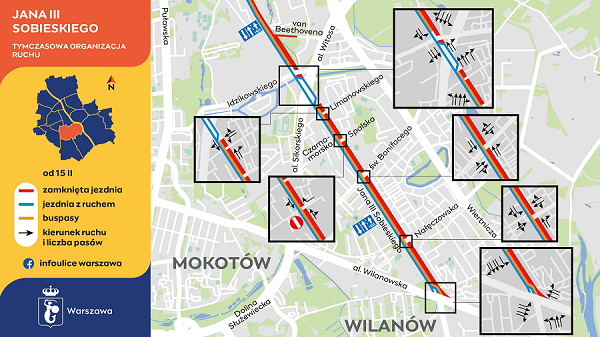 W kolejnym etapie – w nocy ze środy na czwartek, z 15 na 16 lutego – ruch na zachodnią jezdnię ulicy Jana III Sobieskiego zostanie przeniesiony na odcinku od skrzyżowania z aleją Witosa do skrzyżowania z aleją Wilanowską. Natomiast w połowie ferii – w weekend, 18-19 lutego – zmiany będą wprowadzane w alei Rzeczypospolitej. Na odcinku od al. Wilanowskiej do ulicy Klimczaka robotnicy przeniosą ruch w obu kierunkach na jezdnię zachodnią, zaś na odcinku od ul. Klimczaka do ulicy Branickiego – na jezdnię wschodnią. Wdrożenie wszystkich zmian w ruchu uzależnione będzie od warunków atmosferycznych.