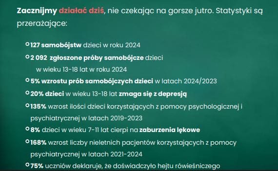 W 2024 roku życie odebrało sobie 127 dzieci, a ponad 2 tysiące podjęło próby samobójcze, wynika z danych stowarzyszenia „Mentalnie Równi”. Liczba młodych pacjentów korzystających z pomocy psychologicznej i psychiatrycznej wzrosła w ostatnich latach aż o 130 proc. Niemal 40 proc. nastolatków przyznaje, że doświadczyło wyzywania w internecie, a co czwarty był tam ośmieszany lub poniżany.