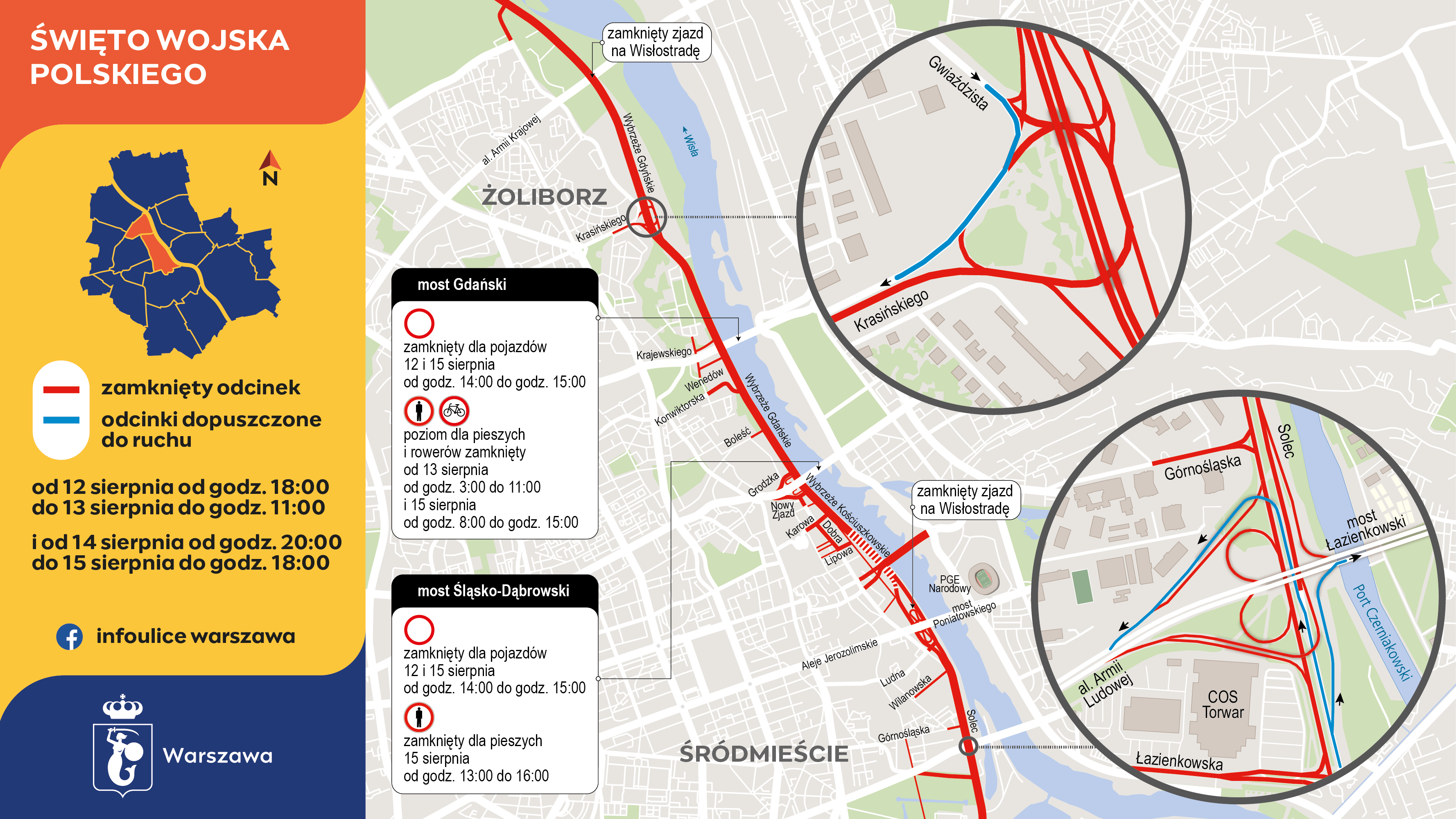 Dodatkowo 13 sierpnia w godzinach 3:00-11:00 oraz 15 sierpnia w godzinach 8:00-15:00 zamknięty dla pieszych i rowerzystów będzie dolny poziom mostu Gdańskiego. W tym czasie na moście nie będą zatrzymywały się również tramwaje. We wtorek w godzinach 13:00-16:00 zamknięty dla niezmotoryzowanych będzie także most Śląsko-Dąbrowski, a od godziny 12:30 do momentu oddania salutu armatniego nie będzie można przejść bulwarami nad Wisłą na wysokości Starówki.