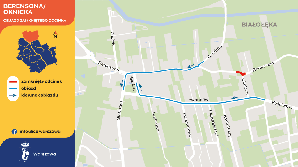 Również w poniedziałek ruszy przebudowa skrzyżowania na Białołęce. Do końca listopada skrzyżowanie Berensona i Oknickiej będzie nieprzejezdne. Objazdy poprowadzą ulicami Lewandów i Głębocką, a także przez Chudoby.