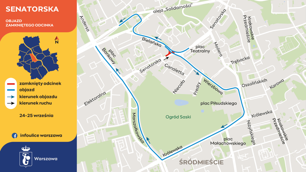 Po awarii wodociągowej drogowcy naprawią fragment ul. Senatorskiej przy skrzyżowaniu z Bielańską. Od poniedziałku (22 września) zamknięty będzie pas w stronę pl. Teatralnego. W kolejnych dniach, 24 i 25 września, prace obejmą również pas w stronę pl. Bankowego.