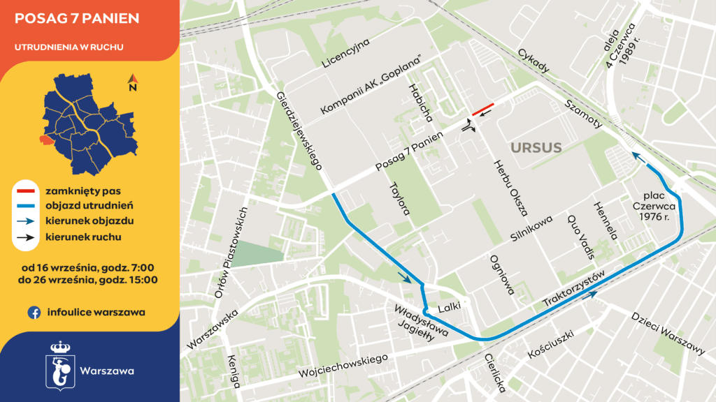Od wtorku, 16 września, na około dziesięć dni jednokierunkowy stanie się odcinek ulicy Posag 7 Panien między wjazdem do zajezdni autobusowej a skrzyżowaniem z Herbu Oksza. Kierowcy przejadą tylko w stronę Gierdziejewskiego, a w przeciwną stronę zostaną skierowani na Traktorzystów.