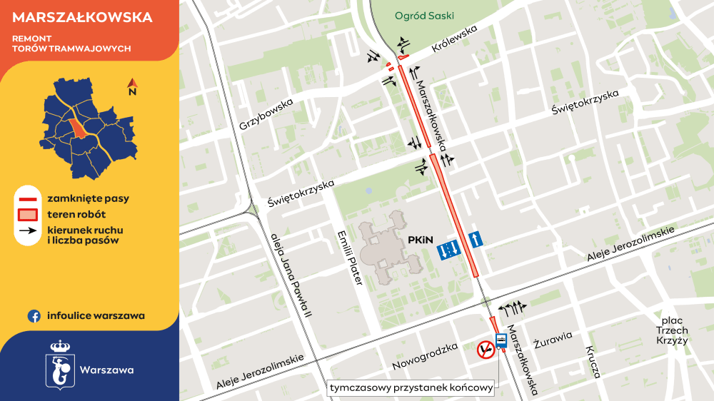Na skrzyżowaniu Marszałkowskiej i Królewskiej trwa przebudowa torowiska. Od południa, 15 września, drogowcy przeniosą prace na stronę Ogrodu Saskiego. Kierowcy jadący od placu Piłsudskiego będą mieli do dyspozycji dwa pasy – jeden do skrętu w lewo w Marszałkowską, drugi do jazdy na wprost i w prawo. Od strony Grzybowskiej także dostępne będą dwa pasy, ale bez możliwości skrętu w lewo w stronę placu Bankowego.