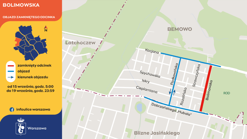 Od 15 września rusza pięciodniowa wymiana nawierzchni na ulicy Bolimowskiej. Ulica będzie całkowicie zamknięta na odcinku od Kocjana do Dobrzańskiego „Hubala”. Objazdy w obu kierunkach poprowadzą przez Podkowińską.