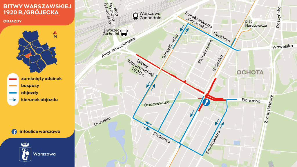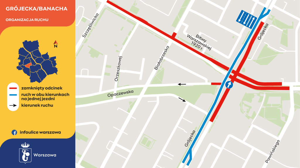 Na skrzyżowaniu Grójeckiej z Bitwy Warszawskiej 1920 r. i Banacha powstaje tzw. pełna gwiazda – układ torów, który pozwoli tramwajom poruszać się we wszystkich kierunkach. Od soboty, 23 sierpnia, kierowcy pojadą drugą jezdnią Grójeckiej, a ulica Bitwy Warszawskiej 1920 r. odzyska połączenie z Grójecką.