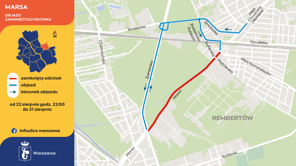 Objazdy poprowadzą od strony Gocławka ulicami: Żołnierską, Strażacką, Zesłańców Polskich, Curlików i Marsa, natomiast od strony Akademii Sztuki Wojennej aleją Chruściela „Montera”, Strażacką i Żołnierską.