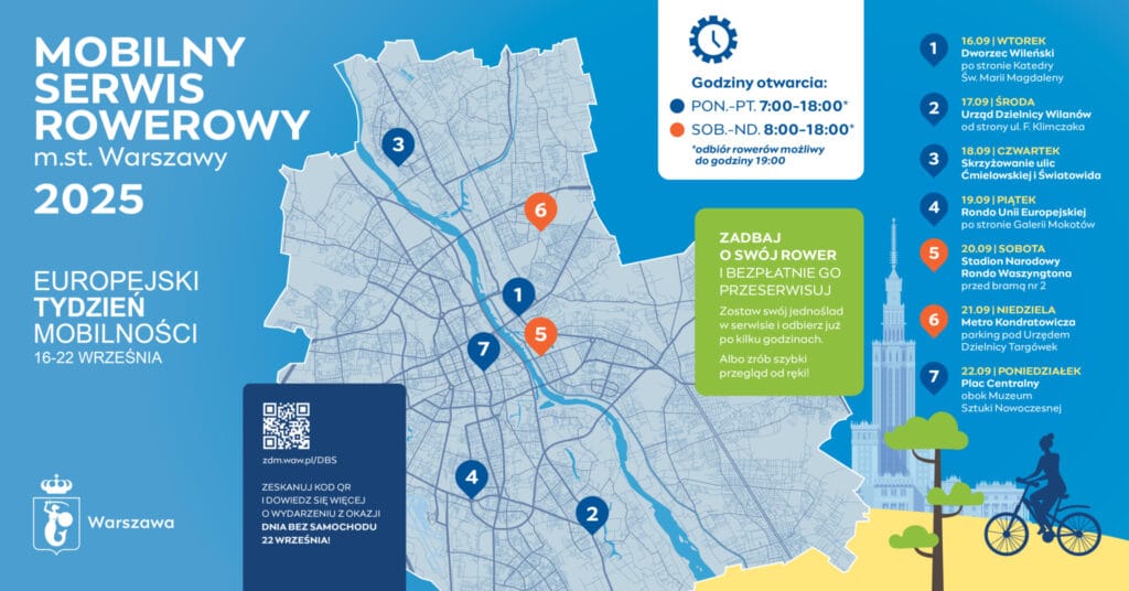 Stałym elementem Europejskiego Tygodnia Mobilności są Mobilne Serwisy Rowerowe, które będą działać codziennie w innym miejscu Warszawy. To świetna okazja, by przygotować rower do jesieni i zimy – bo sezon rowerowy w stolicy trwa cały rok. Serwisy będą otwarte w dniach roboczych w godzinach 7:00–18:00, a w weekend 20–21 września od 8:00 do 18:00.
