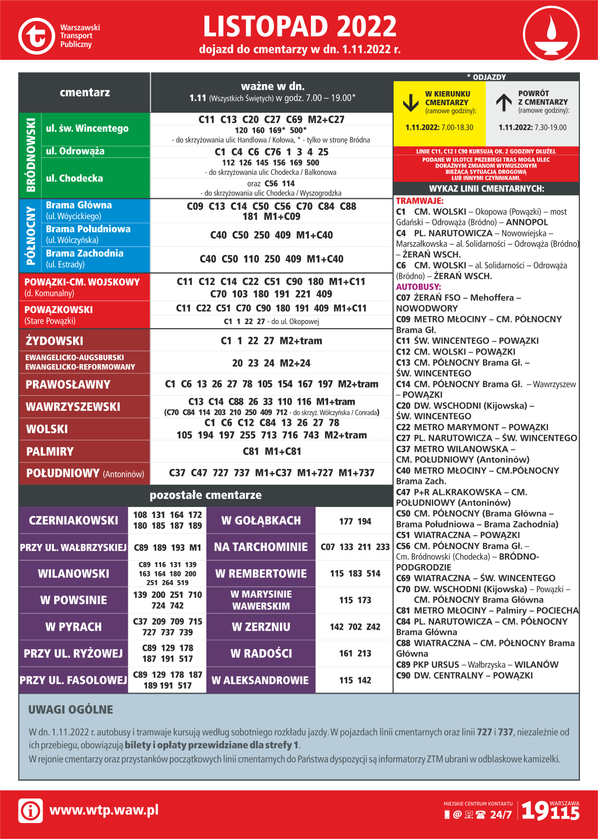 Kursy na liniach cmentarnych zaplanowano dniach 29, 30 i 31 października oraz 2 listopada między godziną 9:00 a 17:00, natomiast 1 listopada między 7:00 a 19:00. Wyjątkiem są linie C11, C12 i C90, które dowożą pasażerów w okolice Cmentarza Powązkowskiego. Wiele osób wybiera się tam na spacer już po zachodzie słońca, po odwiedzeniu rodzinnych grobów w innych rejonach Warszawy. Dlatego we wtorek, 1 listopada, autobusy te będą jeździły w godz. 7:00-21:00.