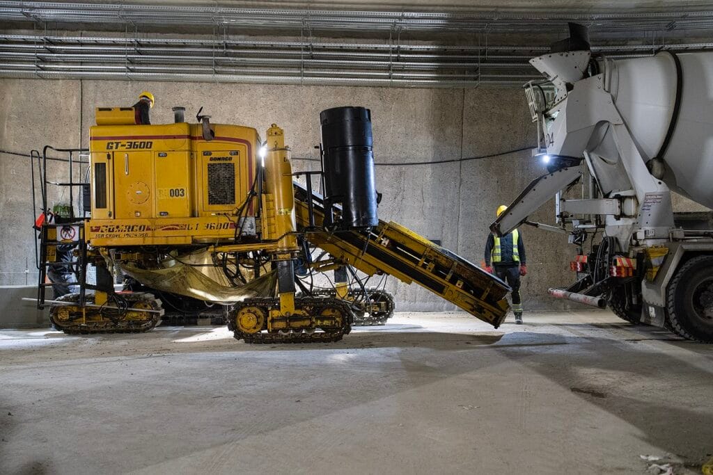 W tunelu trwają prace przy formowaniu tzw. murków oporowych. Powstają one dzięki specjalistycznej maszynie – proces zaczyna się od wylania betonu z tzw. gruszki na taśmę, skąd trafia on do kosza z wibratorami hydraulicznymi, które odpowiadają za jego zagęszczenie. Następnie masa wlewana jest do formy, która nadaje jej ostateczny kształt.