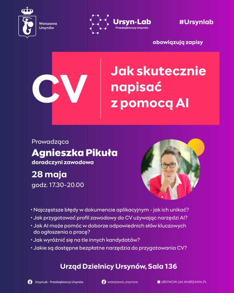 Już w środę, 28 maja UrsynLab organizuje spotkanie, na którym uczestnicy dowiedzą się, jak tworzyć skuteczne CV w czasach, gdy o pierwszym etapie rekrutacji coraz częściej decydują algorytmy sztucznej inteligencji.