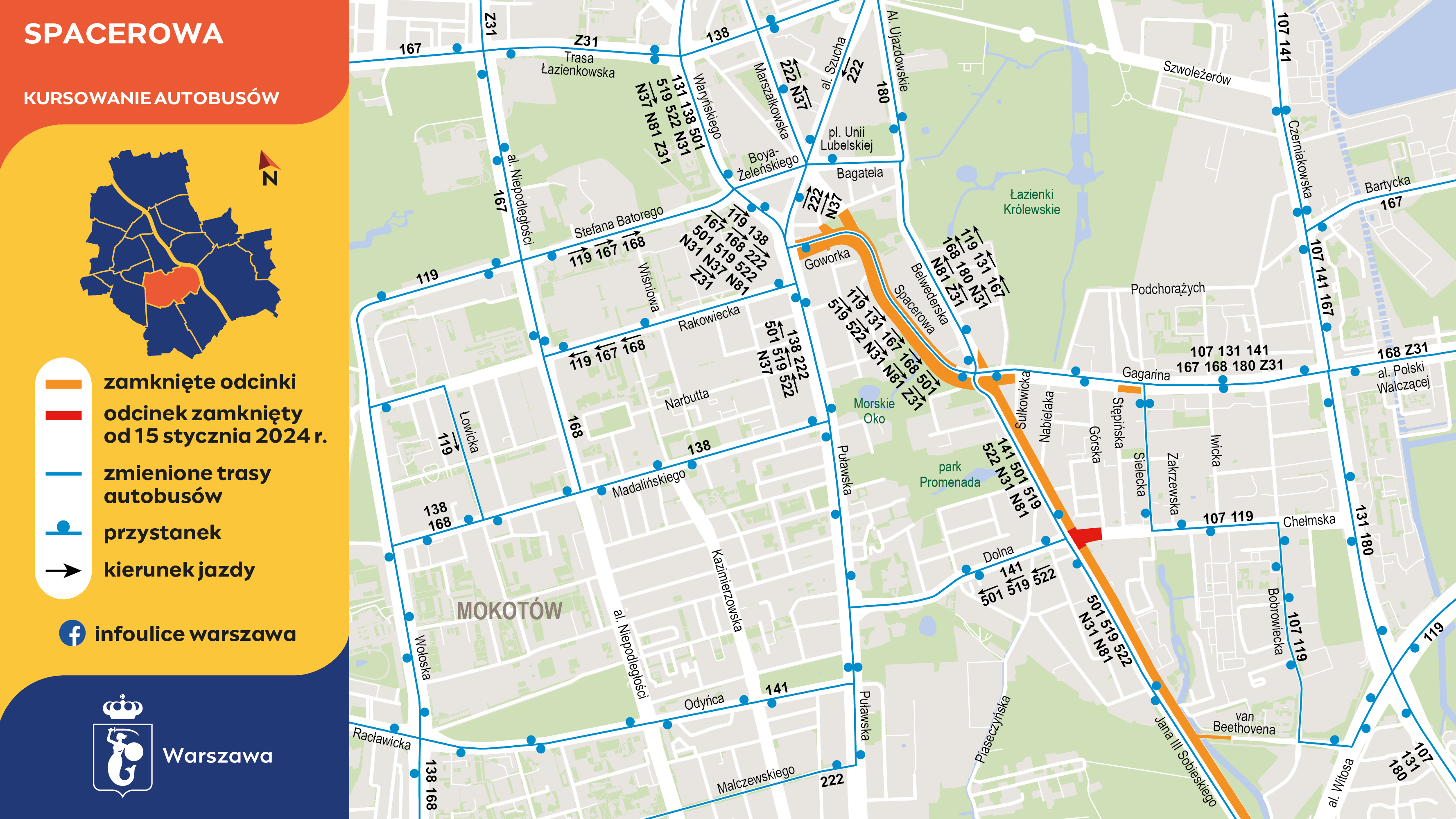 Nie zmienią się trasy autobusów kursujących Sobieskiego i Belwederską, natomiast na trasy objazdowe zostaną skierowane autobusy jeżdżące Chełmską i Dolną. Autobusy linii 119 – w kierunku Wiśniowej Góry – z ulicy Spacerowej pojadą prosto w Gagarina, a następnie Sielecką do Chełmskiej i swojej stałej trasy. W przeciwnym kierunku, do krańca Rakowiecka-Sanktuarium, z ulicy Chełmskiej skręcą w Sielecką i dalej Gagarina, Belwederską i Bagatelą, przez plac Unii Lubelskiej oraz Boya-Żeleńskiego, Waryńskiego i Puławską dojadą do Rakowieckiej, czyli do końcowego odcinka swojej normalnej trasy. Autobusy linii 141 w obydwu kierunkach nie będą jeździły ulicą Chełmską. Ominą ją Belwederską i Gagarina. W obydwu kierunkach trasę zmienią autobusy linii 107 – z Czerniakowskiej skręcą w Gagarina i następnie Sielecką dojadą do Chełmskiej.