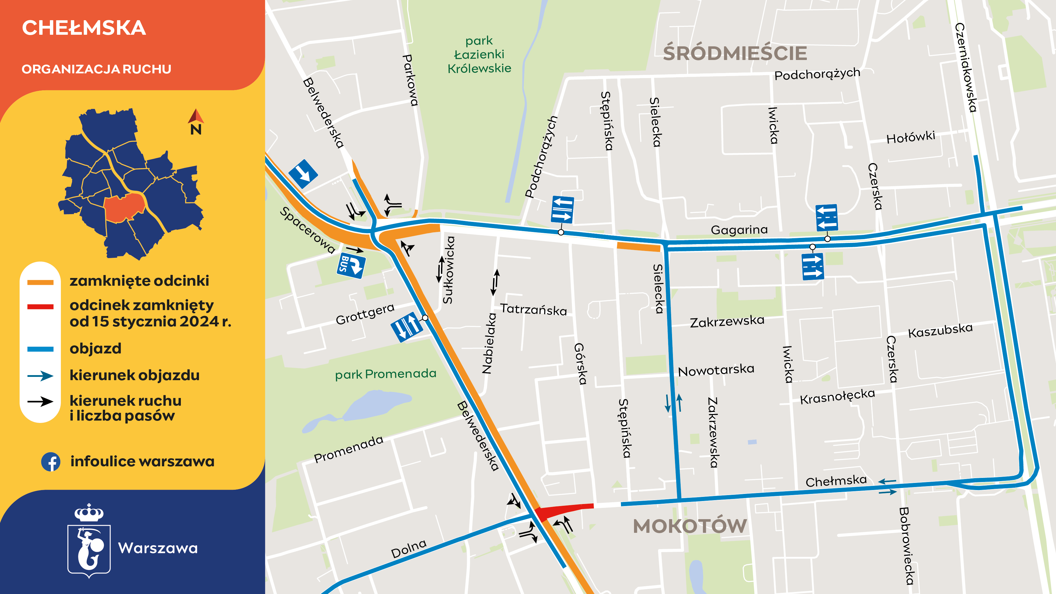 W pierwszym etapie, trwającym od 15 stycznia do końca maja, wykonawca zamknie wylot ul. Chełmskiej w ul. Belwederską. Ulicą Chełmską samochody dojadą najdalej do ul. Górskiej. Na ul. Sobieskiego od strony Wilanowa będą dwa pasy – jeden do skrętu w lewo w Dolną, a drugi do jazdy prosto. Na Belwederskiej, od strony centrum, zostanie jeden pas, z którego kierowcy skręcą w prawo w Dolną albo pojadą prosto. Kierowcy jadący ul. Dolną będą skręcać w prawo w Jana III Sobieskiego albo w lewo – w Belwederską. Objazd do ulicy Chełmskiej pobiegnie ulicami: Belwederską, Gagarina i Czerniakowską.