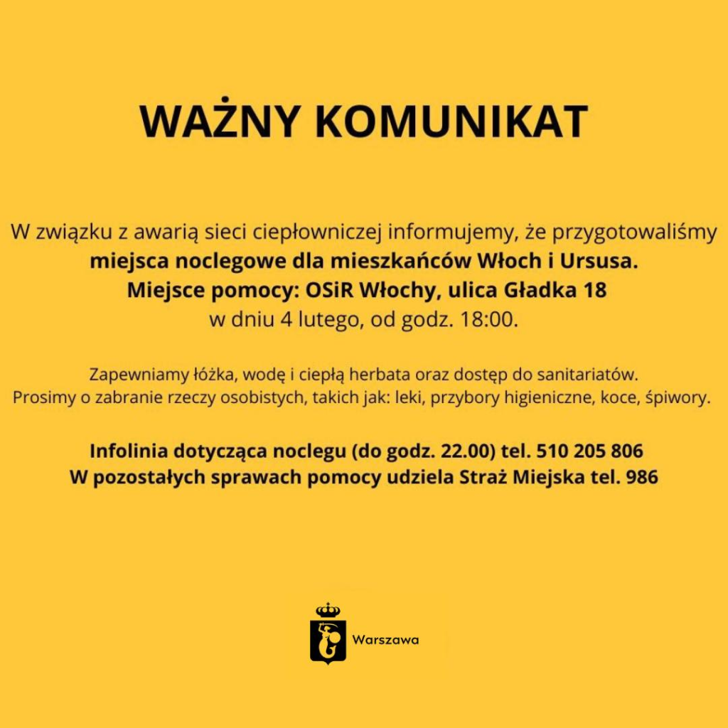 W związku z awarią sieci ciepłowniczej informujemy, że dla mieszkańców Włoch i Ursusa zostały przygotowane miejsca noclegowe. Na miejscu zapewnione zostaną łóżka, wodę i ciepłą herbata oraz dostęp do sanitariatów. Prosimy o zabranie rzeczy osobistych, takich jak: leki, przybory higieniczne, koce, śpiwory, powerbanki itp.