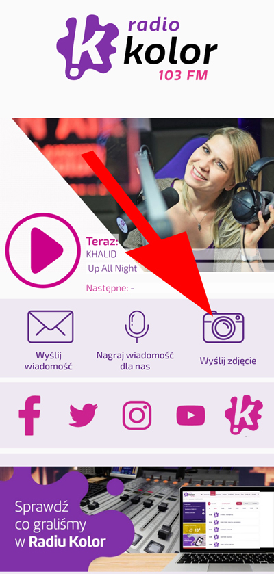 2. W naszej aplikacji kliknij na ikonkę aparatu i napisz do nas wiadomość, w której opisz nam jak słuchasz Radia Kolor. Pokaż nam zdjęcie obrazujące słuchanie nas oraz dodaj kilka słów od siebie. Jak to zrobić?