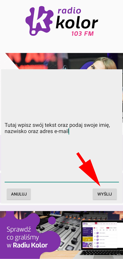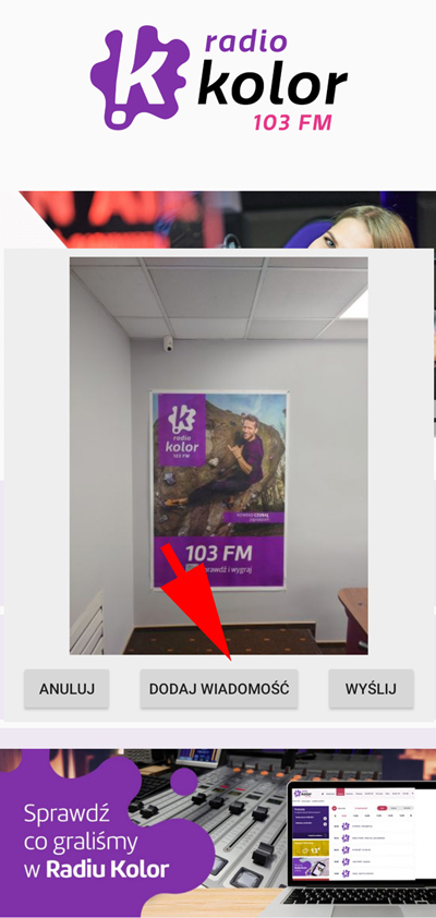 2. W naszej aplikacji kliknij na ikonkę aparatu i napisz do nas wiadomość, w której pokaż nam jak słuchasz Radia Kolor. Czekamy na zdjęcia i tekstowe opisy – wykaż się kreatywnością!