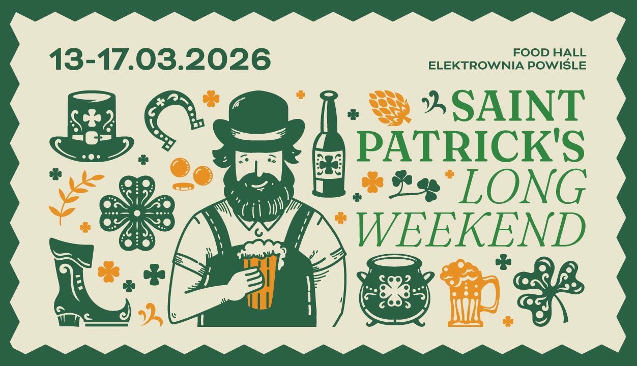 Irlandzki duch przejmie warszawskie Powiśle na pięć dni. Od 13 do 17 marca Food Hall Elektrowni Powiśle zamieni się w miejsce celebracji Dnia Świętego Patryka – z irlandzką muzyką na żywo, pokazami tańca, szczudlarzami, zielonymi dekoracjami i atmosferą prosto z ulic Dublina. Saint Patrick’s Long Weekend zapowiada się jako największa celebracja tego święta w Polsce. Wydarzenie odbywa się pod honorowym patronatem Ambasady Irlandii w Polsce.