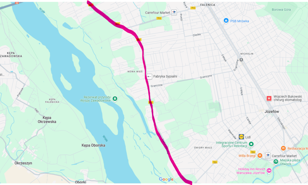 Chodzi o 5 kilometrów trasy od POW do skrzyżowania z drogą wojewódzką numer 721 w Józefowie. To częściowo ulica Wał Miedzeszyński na terenie Warszawy, a częściowo ulica Nadwiślańska w Józefowie. Codziennie przejeżdżają nią tysiące samochodów, a jej nawierzchnia miejscami jest w bardzo złym stanie. Przebudowa będzie wspólnym działaniem Mazowieckiego Zarządu Dróg Wojewódzkich oraz Stołecznego Zarządu Rozbudowy Miasta.