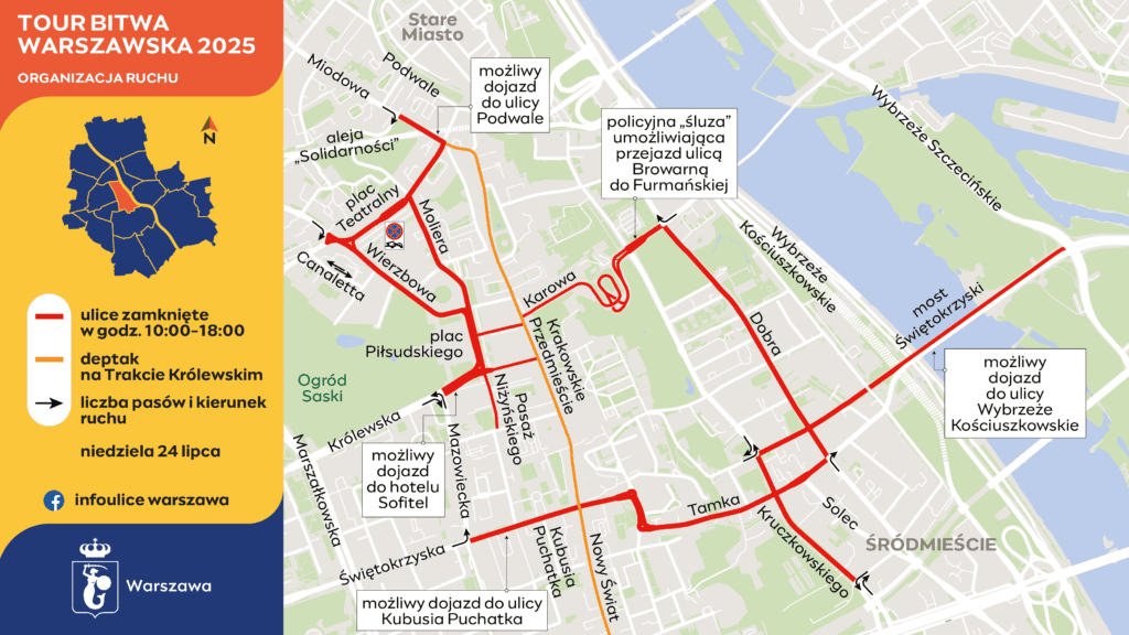 Ostatni etap zawodów kolarskiego Tour Bitwy Warszawskiej odbędzie się w samym sercu stolicy. W niedzielę, 24 sierpnia, najlepszych zawodników będzie można zobaczyć w rejonie Starego Miasta i Powiśla. Ulice na trasie zawodów będą zamknięte, a kursujące tamtędy autobusy pojadą objazdami.