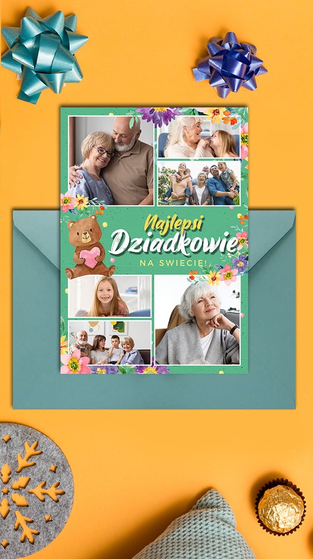 Kartkę możesz zaprojektować według własnego pomysłu. Ułatwiają to dziesiątki szablonów, dzięki którym łatwo znajdziesz atrakcyjne propozycje. Jak wygląda cały proces? Jest banalnie prosty! Wybierasz napis na froncie np. Kochanym Dziadkom, Dla Babci, Dla Dziadka itp. Następnie dodajesz swoje imię lub imię odbiorcy (odbiorców). Co dalej? Stwórz kolaż Twoich wspólnych zdjęć z seniorami rodu.