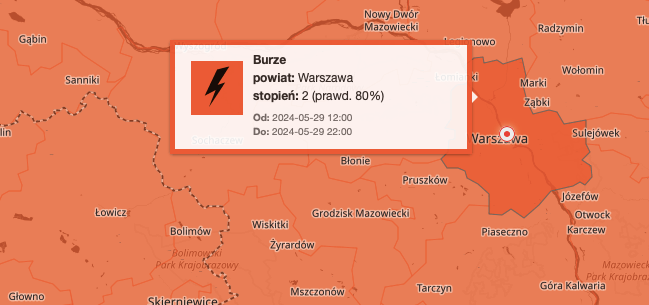 Instytut Meteorologii i Gospodarki Wodnej wydał ostrzeżenie drugiego stopnia przed burzami na Mazowszu. Prawdopodobieństwo wystąpienia zjawiska 80%.