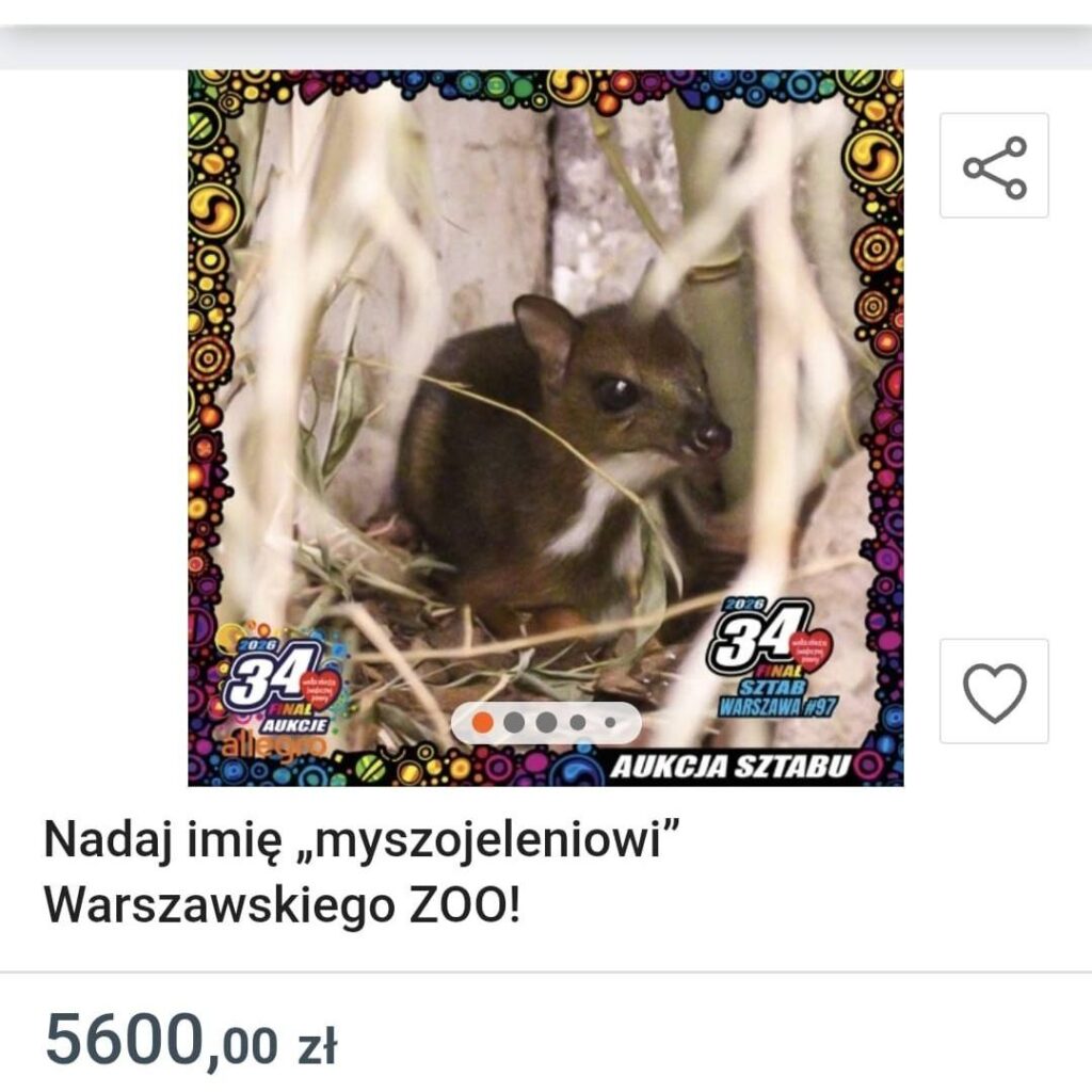 Warszawskie ZOO podliczyło swoje licytacje na rzecz 34. Finału Wielkiej Orkiestry Świątecznej Pomocy. Łącznie na konto fundacji trafi ponad 20 tys. złotych. Największe emocje wzbudziła licytacja imienia dla nowo narodzonego „myszojelenia”, ale nie była to najdroższa aukcja ze wszystkich.