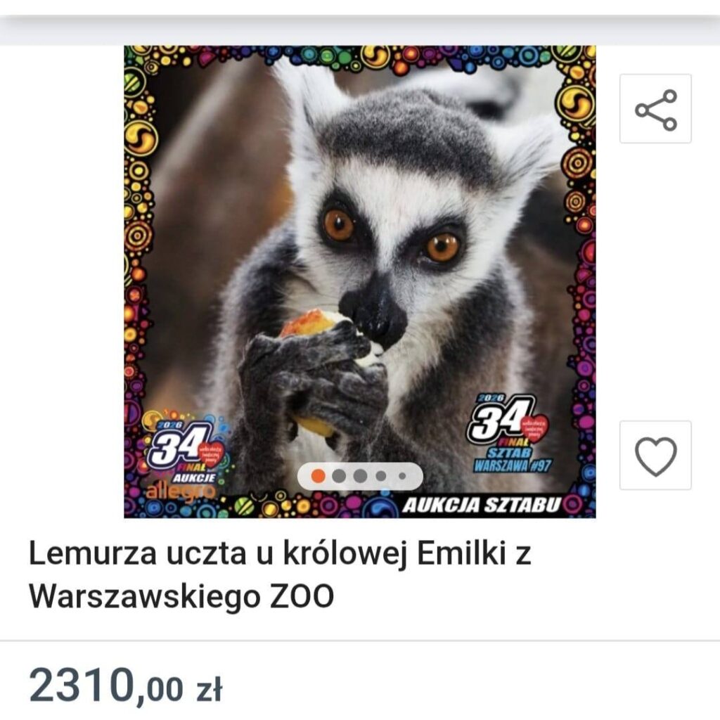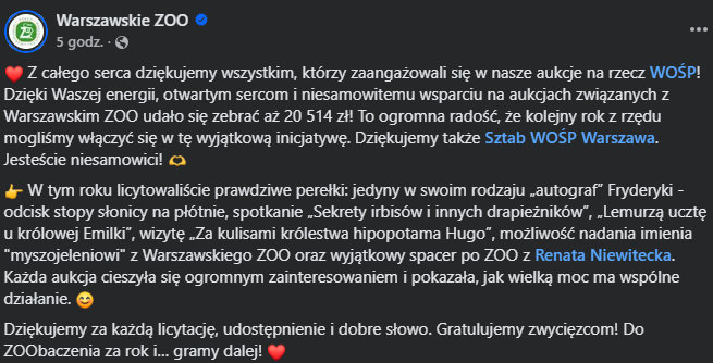 Sześć wyjątkowych aukcji, przygotowanych przez Warszawskie ZOO, dobiegło końca. Jak zdradziła naszej reporterce Anna Tadra – kierowniczka działu marketingu i sprzedaży ZOO – łączna suma ze wszystkich licytacji wyniosła 20 514 złotych. Pieniądze te zasilą konto 34. Finału WOŚP, którego celem w tym roku jest diagnostyka i leczenie chorób układu pokarmowego u dzieci.