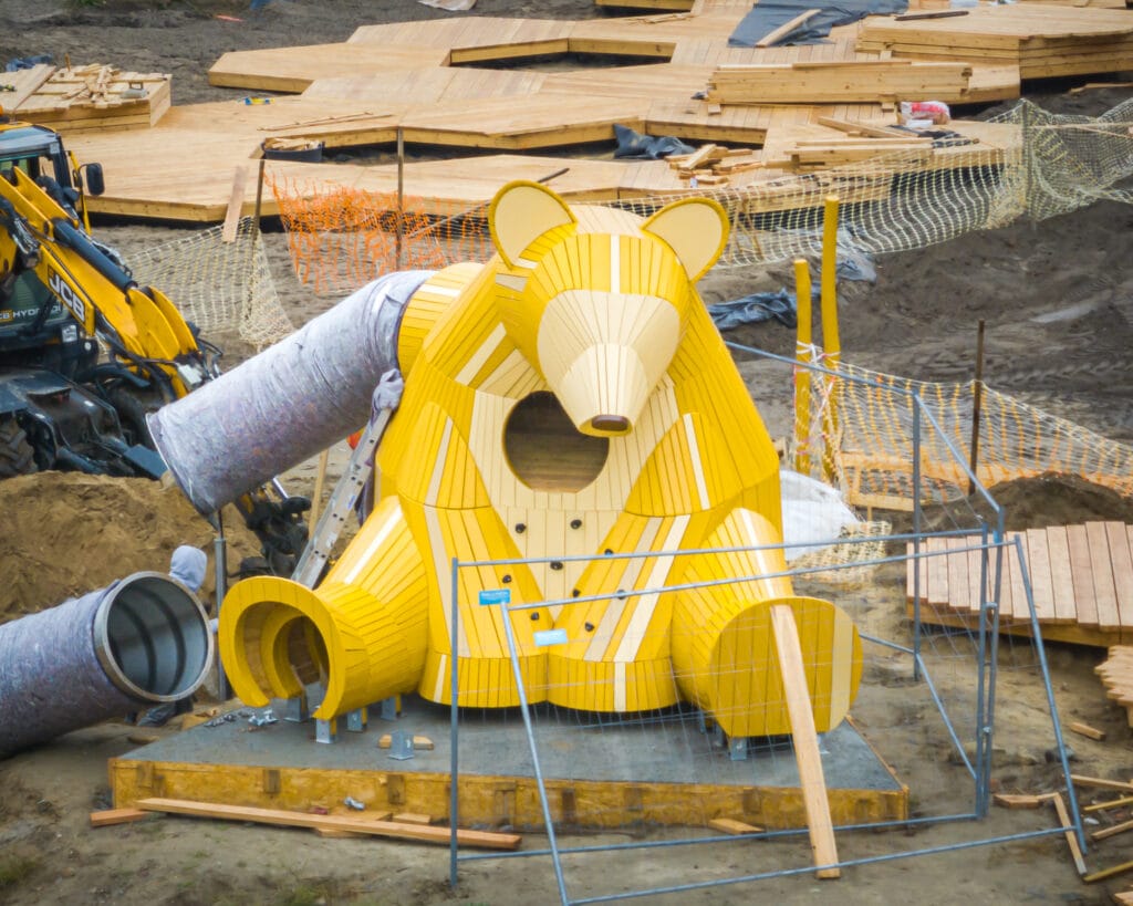 W budowanym parku linearnym na Ursynowie pojawił się drewniany miś i baryłki, które są jednym z elementów powstającego placu zabaw. Konstrukcja już budzi spore zainteresowanie.