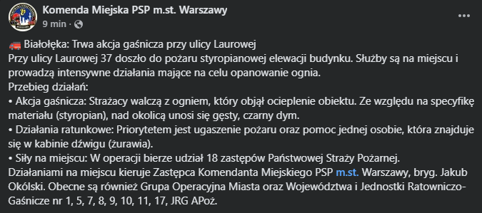 Jak mówi nam mł. kap. Karolina Jaworska, oficer prasowy Komendy Wojewódzkiej Państwowej Straży Pożarnej w Warszawie, doszło do pożaru elewacji nowopowstającego budynku przy ul. Laurowej. Ewakuowano pracowników budowy, równolegle prowadzona jest ewakuacja operatora żurawia. Ogniem zajęło się ok. 50 metrów elewacji.