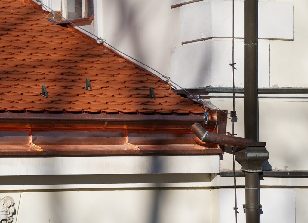 Dodatkowo podczas prac wymieniono skorodowane i wypaczone fragmenty więźby i deskowania dachu. Nowe elementy wykonano z drewna suchego, struganego i zaimpregnowano preparatem chroniącym go przed ogniem, grzybami i owadami. Wszystkie obróbki blacharskie, rynny i rury spustowe wykonano z blachy miedzianej.