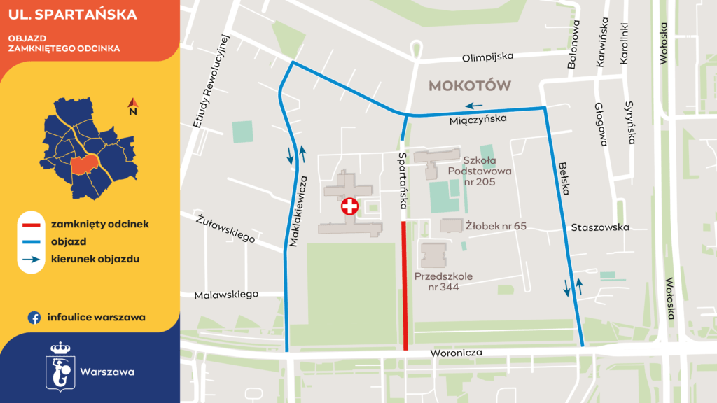 Żeby dojechać do Spartańskiej trzeba będzie skorzystać z objazdów. Od strony Miączyńskiej będzie można dojechać ulicą Bełską lub Maklakiewicza, przez cały czas prac drogowych będzie zapewniony dojazd do placówek dla najmłodszych oraz Narodowego Instytutu Geriatrii, Reumatologii i Rehabilitacji. W miarę postępów prac drogowcy będą udostępniali kierowcom gotowe fragmenty ulicy.