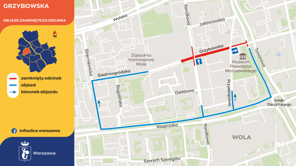 Ruch na Grzybowskiej przy Muzeum Powstania Warszawskiego będzie odbywał się tylko w jednym kierunku – w stronę Towarowej. Piesi przejdą wyłącznie po stronie muzeum. Jeden kierunek obowiązuje także na Karolkowej przy skrzyżowaniu z Grzybowską – przejazd możliwy jest tylko w stronę Wolskiej.
