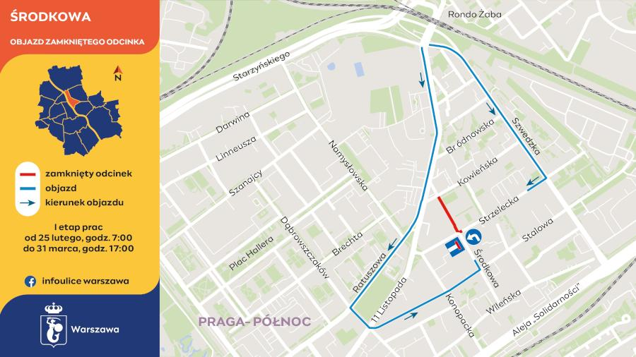Przejazd na wprost ulicą Strzelecką będzie niemożliwy. Dodatkowo przy skrzyżowaniach z Kowieńską i Strzelecką wygrodzone zostaną wybrane miejsca parkingowe. Przejście dla pieszych wzdłuż Środkowej będzie możliwe wyłącznie chodnikiem po stronie nieparzystej. Ta faza robót potrwa do końca marca.