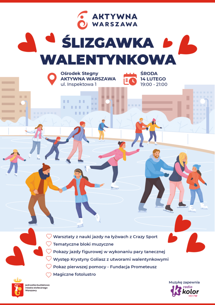 Razem z Stołeczne Centrum Sportu Aktywna Warszawa zapraszamy na „Ślizgawkę walentynkową”, która odbędzie się 14 lutego w godzinach 19:00-21:00 w Ośrodku Stegny (ul. Inspektowa 1).