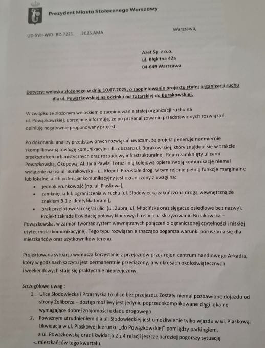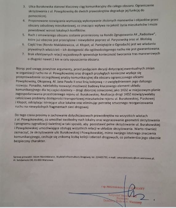 Poniżej prezentujemy treść pisma wysłanego przez władze Woli do projektanta:
