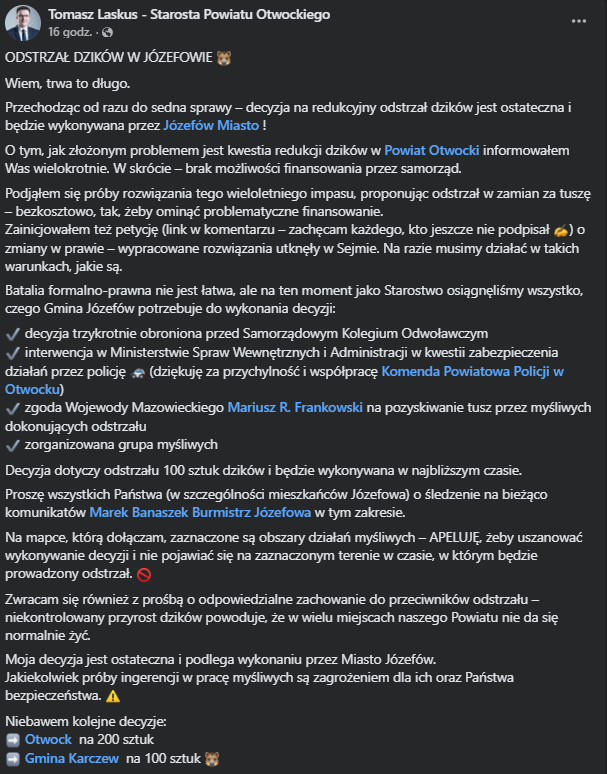Józefów to tylko pierwszy etap działań władz powiatu. Starosta zapowiedział, że przygotowywane są już kolejne decyzje dla sąsiednich gmin. W najbliższych planach jest odstrzał łącznie 300 kolejnych zwierząt – w Otwocku 200 sztuk, a w gminie Karczew 100.