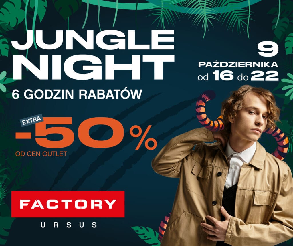 FACTORY Ursus to wyjątkowe centrum outletowe, należące do największej sieci obiektów tego formatu w kraju. Na klientów czekają tam salony outletowe najpopularniejszych marek premium i średniego segmentu w stale obniżonych cenach do nawet 70%. Podczas Jungle Night zyskają dodatkowe 50% rabaty.