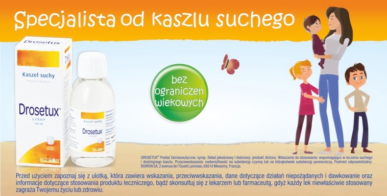 Jeśli standardowe leki przeciwkaszlowe odpadają, co możemy dać dziecku, żeby zmniejszyć dyskomfort spowodowany suchym kaszlem? Możesz podać kaszlącemu dziecku syrop DROSETUX® firmy BOIRON, który przyniesie ulgę w przypadku drażniącego i suchego kaszlu. Taki syrop można podawać dzieciom bez ograniczeń wiekowych. Drosetux zmniejsza nasilenie i częstotliwość kaszlu i jest bezpieczny dla Twojego Malucha.