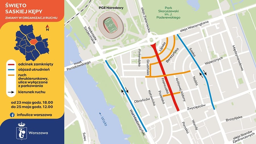 Jeśli wybieracie się na święto Saskiej Kępy należy pamiętać, że ze względu na obchody organizacja ruchu ulegnie zmianie. Ulica Francuska zostanie zamknięta w piątek, 23 maja, o godzinie 18:00. Do niedzieli, 25 maja, do południa kierowcy nie przejadą od ulicy Zwycięzców do ronda Waszyngtona. Szczegóły mówi Mirosław Salach, dyrektor Centrum Promocji Kultury na Pradze Południe.