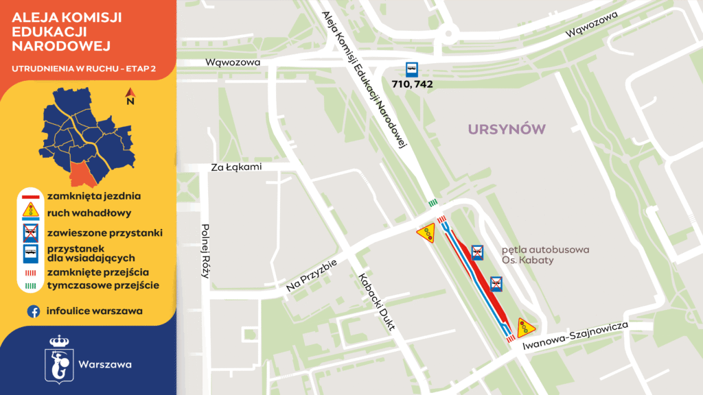 W najbliższy weekend wprowadzony zostanie pierwszy etap czasowej organizacji ruchu. Obejmie on wyłącznie komunikację miejską i pasażerów linii podmiejskich. Autobusy linii 710 w kierunku Piaseczna będą dojeżdżać do przystanku Metro Kabaty 02 (al. KEN za skrzyżowaniem z Wąwozową), a przystanek dla wsiadających z Kabat będzie na ul. Wąwozowej (Metro Kabaty 03).