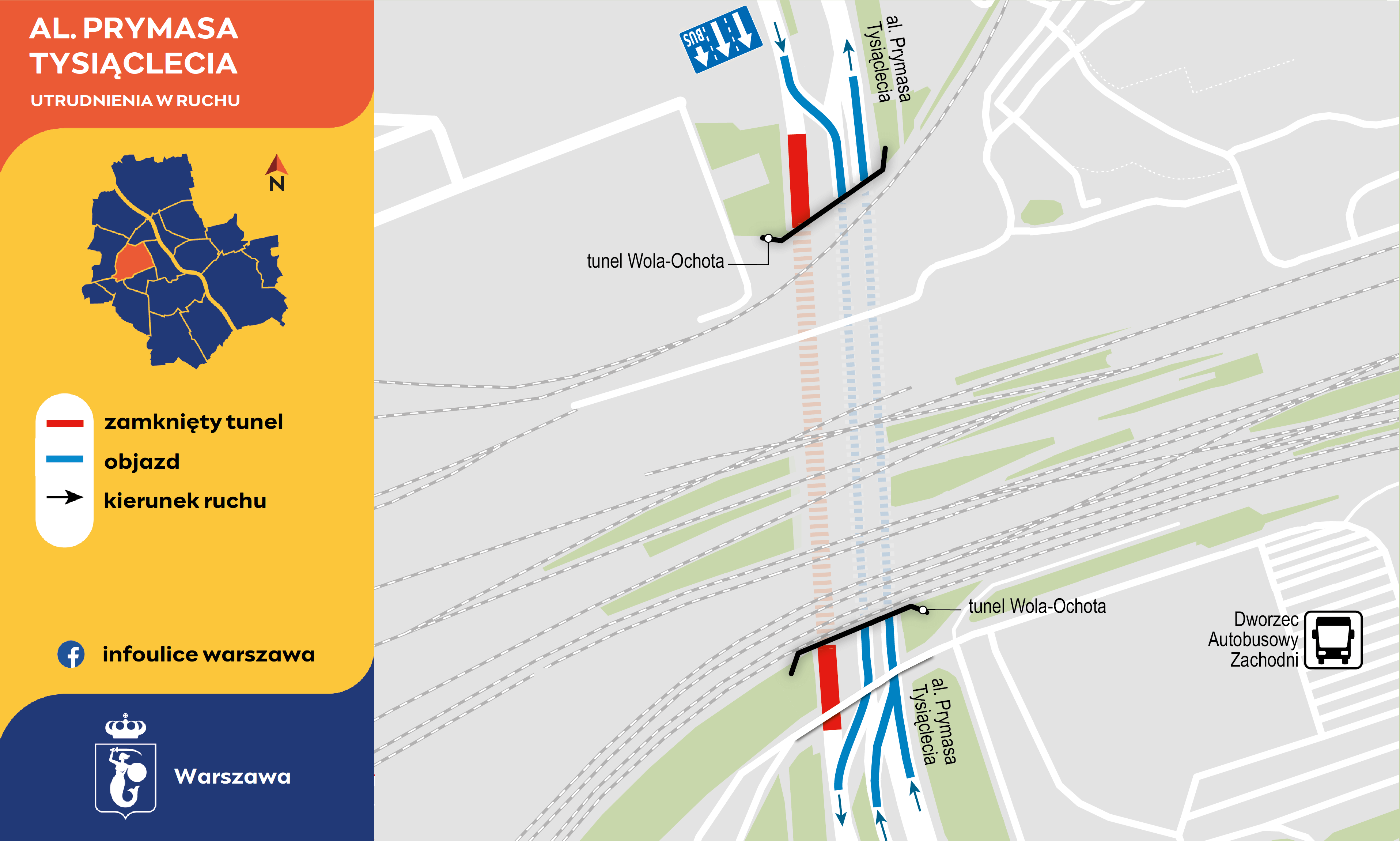 Kolejarze rozpoczęli nowe prace w popularnym tunelu w alei Prymasa Tysiąclecia. Na początku czerwca wprowadzili zmiany dla pieszych i rowerzystów. Teraz przyszedł czas by zająć część tunelu. Od rana 17 lipca zamknięta jest część tunelu prowadząca w stronę rodna Zesłańców Syberyjskich. Już za rondem Tybetu jezdnia zwęża się do dwóch pasów (z trzeciego będą mogły korzystać wyłącznie autobusy), a na wysokości przystanku autobusowego Armatnia 01 kierowcy kierowani są do środkowej nawy przekopu. Tam kierowcy mają do dyspozycji dwa pasy ruchu: jeden do jazdy w lewo i prosto, a drugi do jazdy prosto i w prawo. Zmiana kierunku – po wyjeździe z tunelu – będzie już niemożliwa.