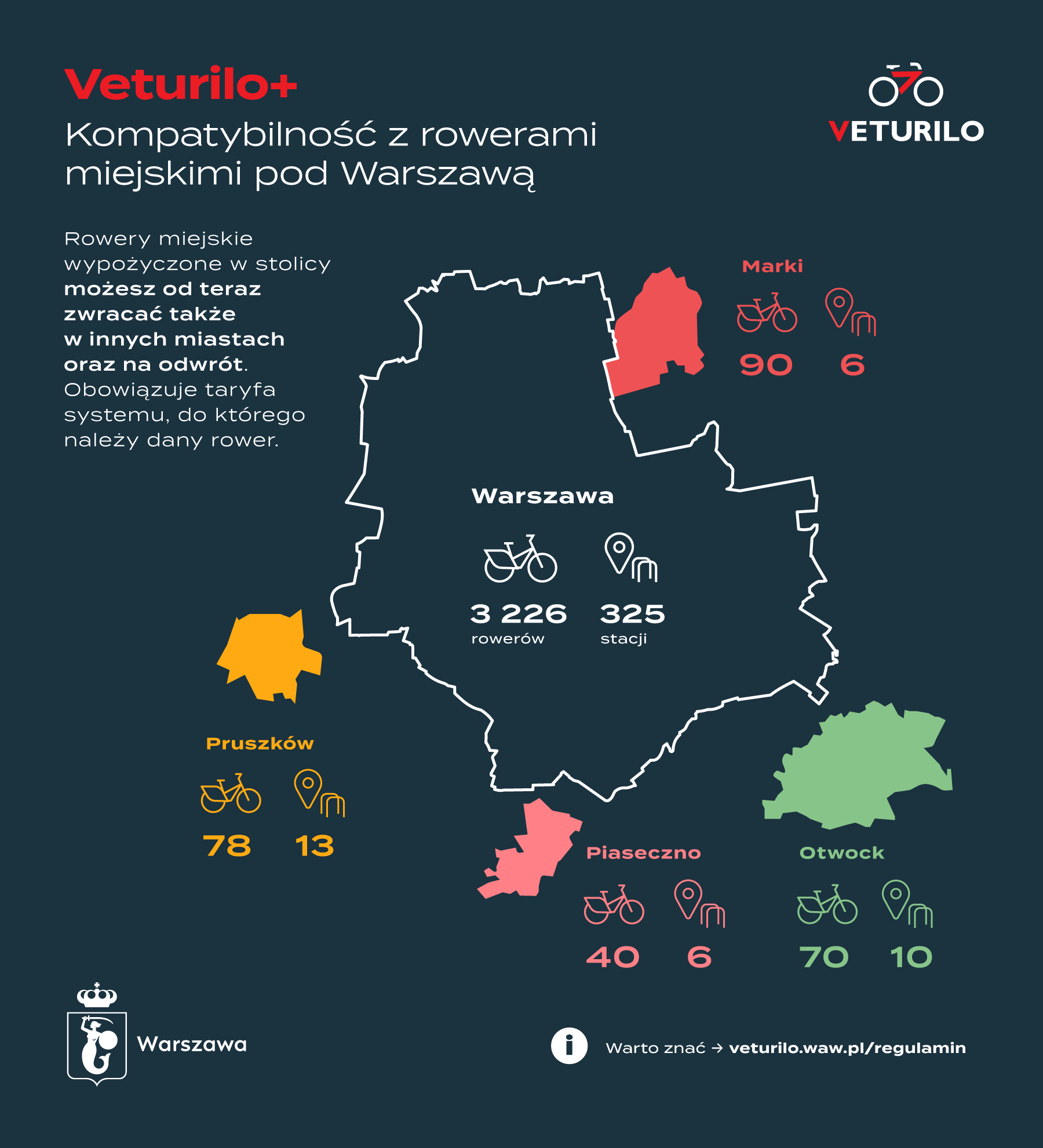 W praktyce oznacza to, że na stacjach Veturilo można oddać pojazd każdego z kompatybilnych systemów, a warszawskie rowery bez problemu zwrócimy w każdej z tych miejscowości. Wszystkie jednoślady są wyraźnie oznaczone marką „swojego” miasta. Przy wypożyczaniu obowiązuje taryfa właściwa dla systemu, z którego pochodzi konkretny rower. Szczegóły określone są w regulaminie Veturilo, który przeszedł niezbędną aktualizację. Porozumienie ws. kompatybilności między Warszawą i jej sąsiadami będzie obowiązywało też w kolejnych latach.