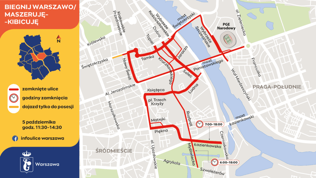 Pozostałe ulice na trasie „Biegnij Warszawo” i „Maszeruję-Kibicuję” zostaną zamknięte o godzinie 11:30. Podczas zawodów kierowcy nie będą mogli wyjechać z ulic oraz dróg osiedlowych bezpośrednio łączących się z trasami obu wydarzeń.