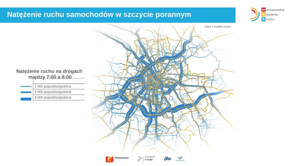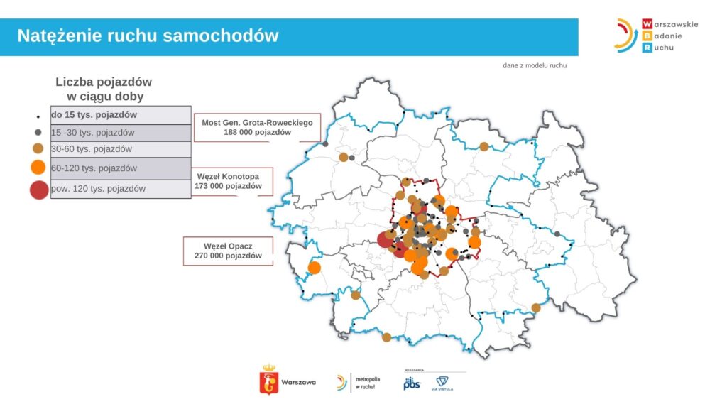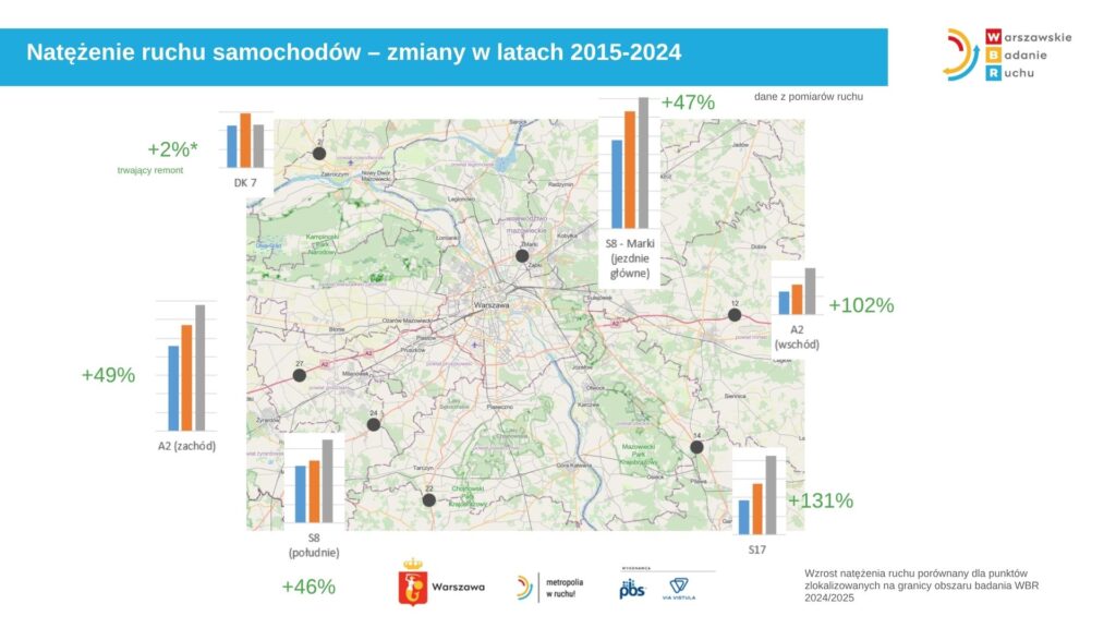 Jak wynika z pomiarów ruchu, liczba pojazdów przekraczających granice Warszawy wzrosła z ok. 0,96 mln w 2015 roku do ok. 1,7 mln w roku 2025.