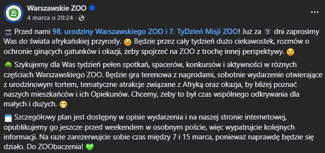 Zabawa oraz wydarzenia edukacyjne w ramach Tygodnia Misji Ogrodów Zoologicznych i Akwariów potrwają przez cały tydzień, aż do 15 marca. Kulminacyjnym punktem obchodów będzie oczywiście środa, 11 marca, kiedy to Warszawskie ZOO będzie obchodzić swoje oficjalne, 98. urodziny.