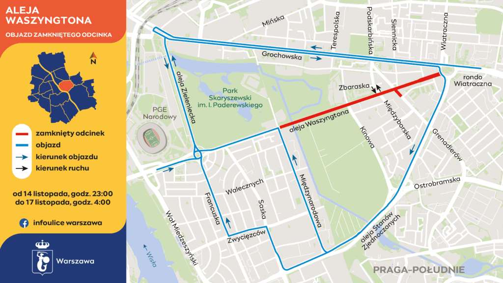 Na Pradze-Południe remont rozpocznie się w piątek o godzinie 23:00 i potrwa do poniedziałku, 17 listopada, do godziny 4:00. W tym czasie aleja Waszyngtona będzie całkowicie zamknięta w obu kierunkach – na odcinku między ulicą Międzynarodową a rondem Wiatraczna.